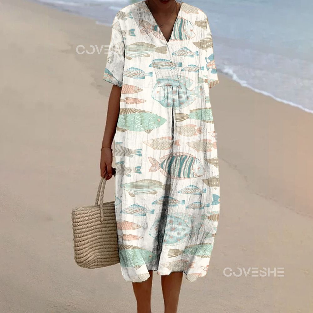 Women's Vintage Fish Printed Flowy Dress