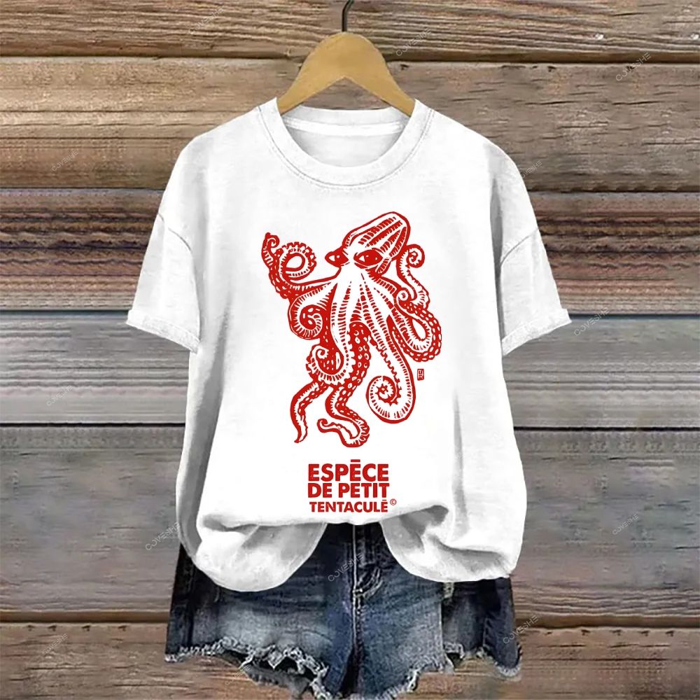Crew Neck Casual Octopus Printed Cotton T-shirt