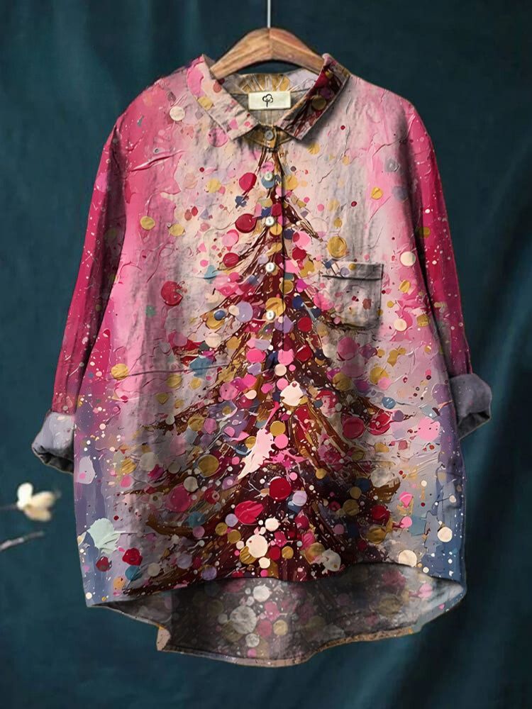 Funny Pink Christmas Christmas Tree Pattern Printed Cotton Linen Shirt