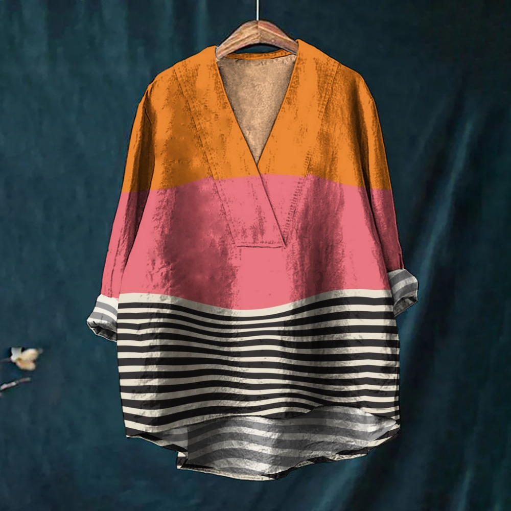 Women's Vintage Colorblock Stripe Print Casual V-neck Shirt