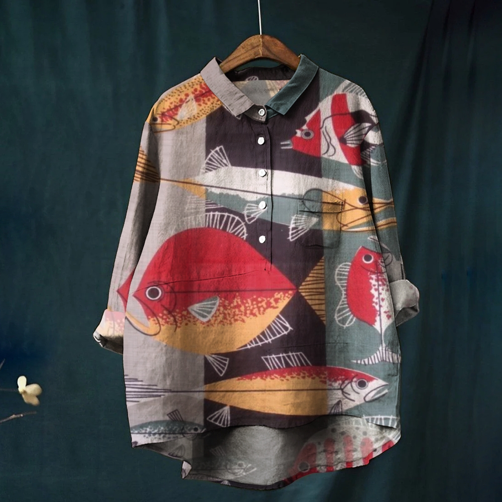 Women's Vintage Colorblock Fish Print Casual Shirt