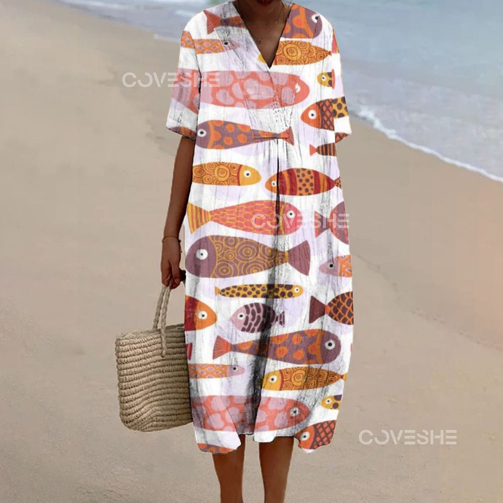 Women's Vintage Colorful Fish Print Flowy Dress