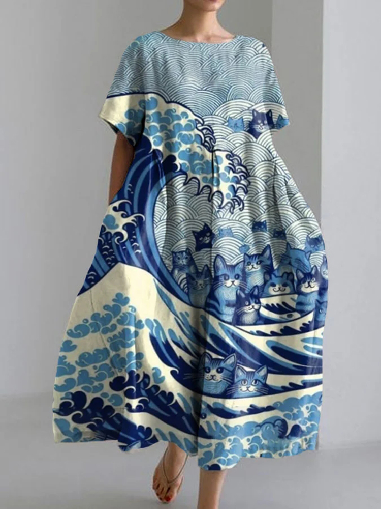 Women's Blue Waves & Cats Print Casual Midi Dress
