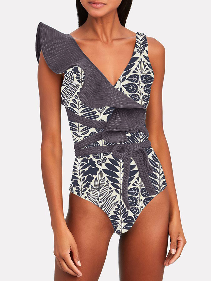 Deep V-Neck Colorblock Print Ruffle One-Piece Swimsuit