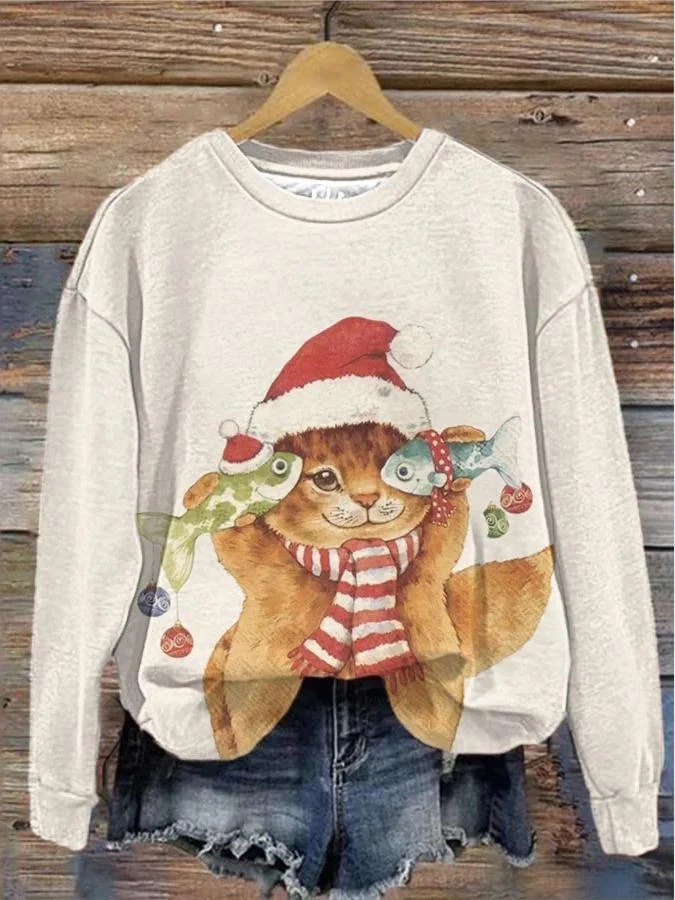 Funny Christmas Cat Fish Art Pattern Print Casual Sweatshirt