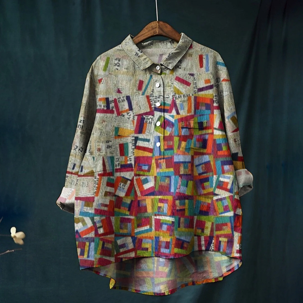 Shibori Patchwork Pattern Printed Women's Casual Long Sleeve Comfortable Cotton Shirt
