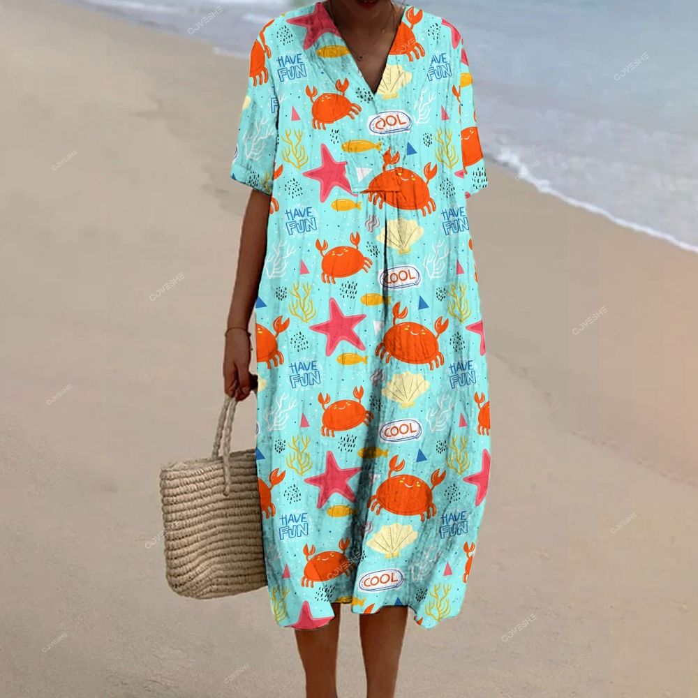 Women's Cartoon Starfish Crab Printed Flowy Dress