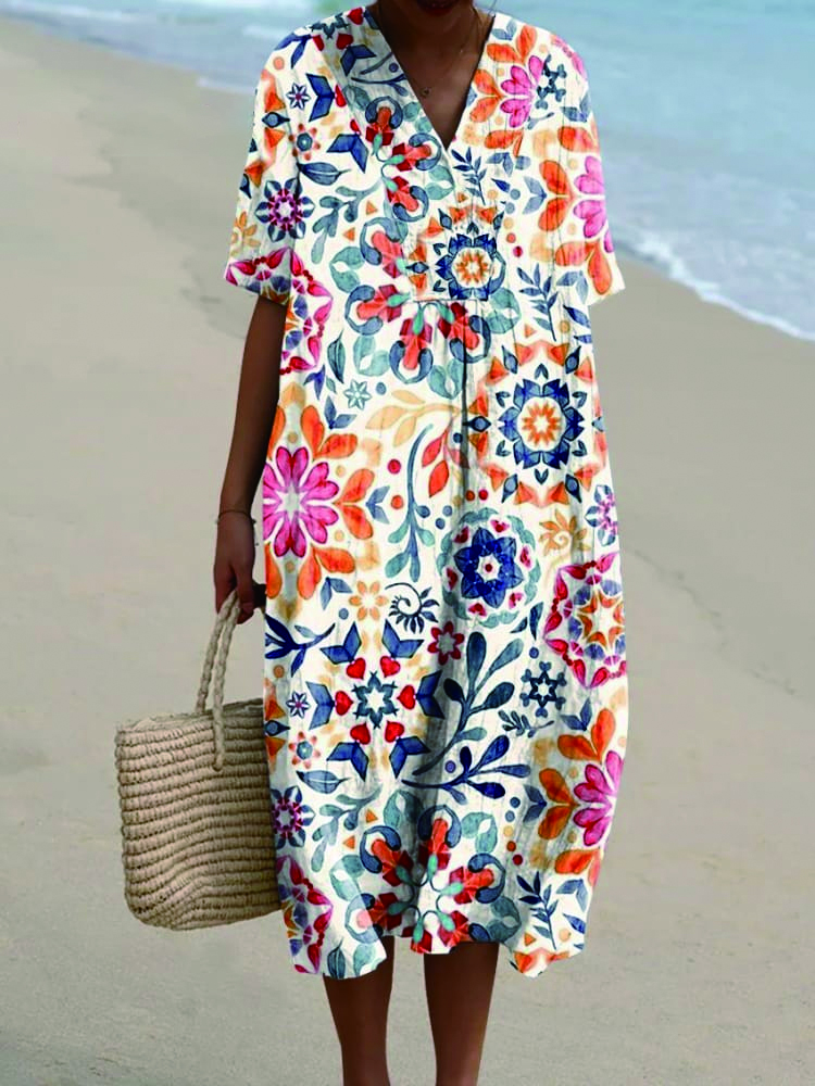 Women's Colorful Watercolor Vintage Floral Print Pocket Dress