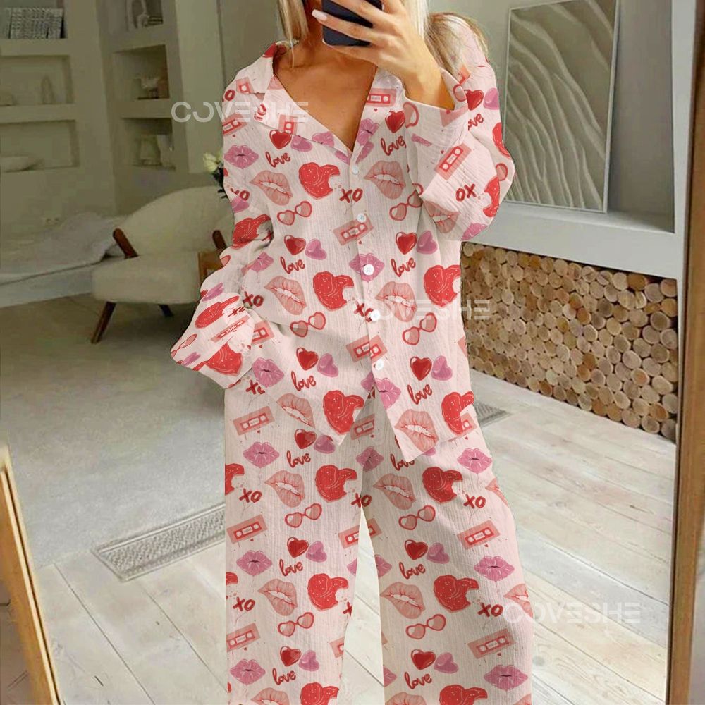 Women's Heart Love Printed Cotton Cardigan Homewear Set