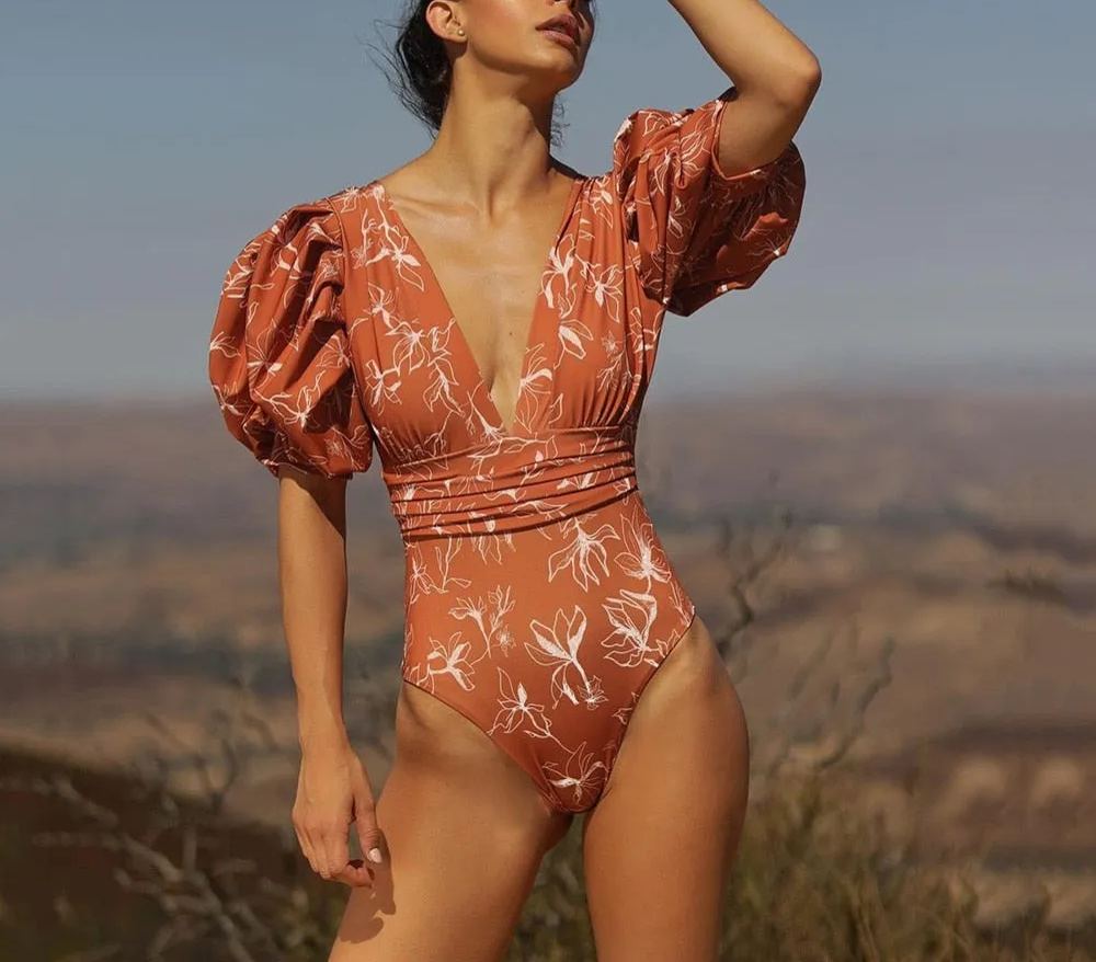 V Neck Puff Sleeve Backless One Piece Swimsuit