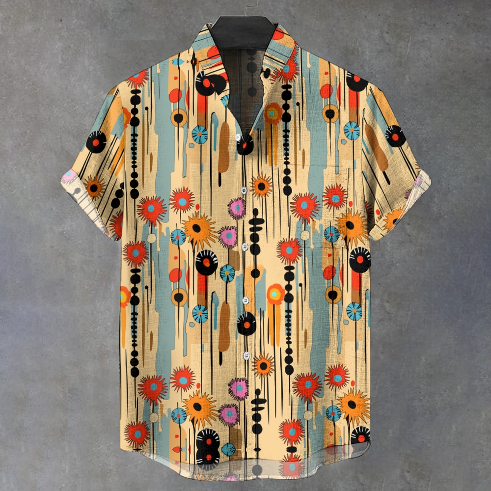 Men's Stand Collar Geometric Line Fish Printed Short Sleeve Shirt