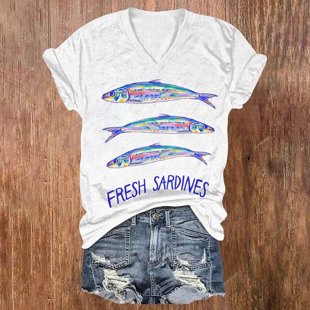 Women's V-neck Sardines Printed Short Sleeve T-shirt