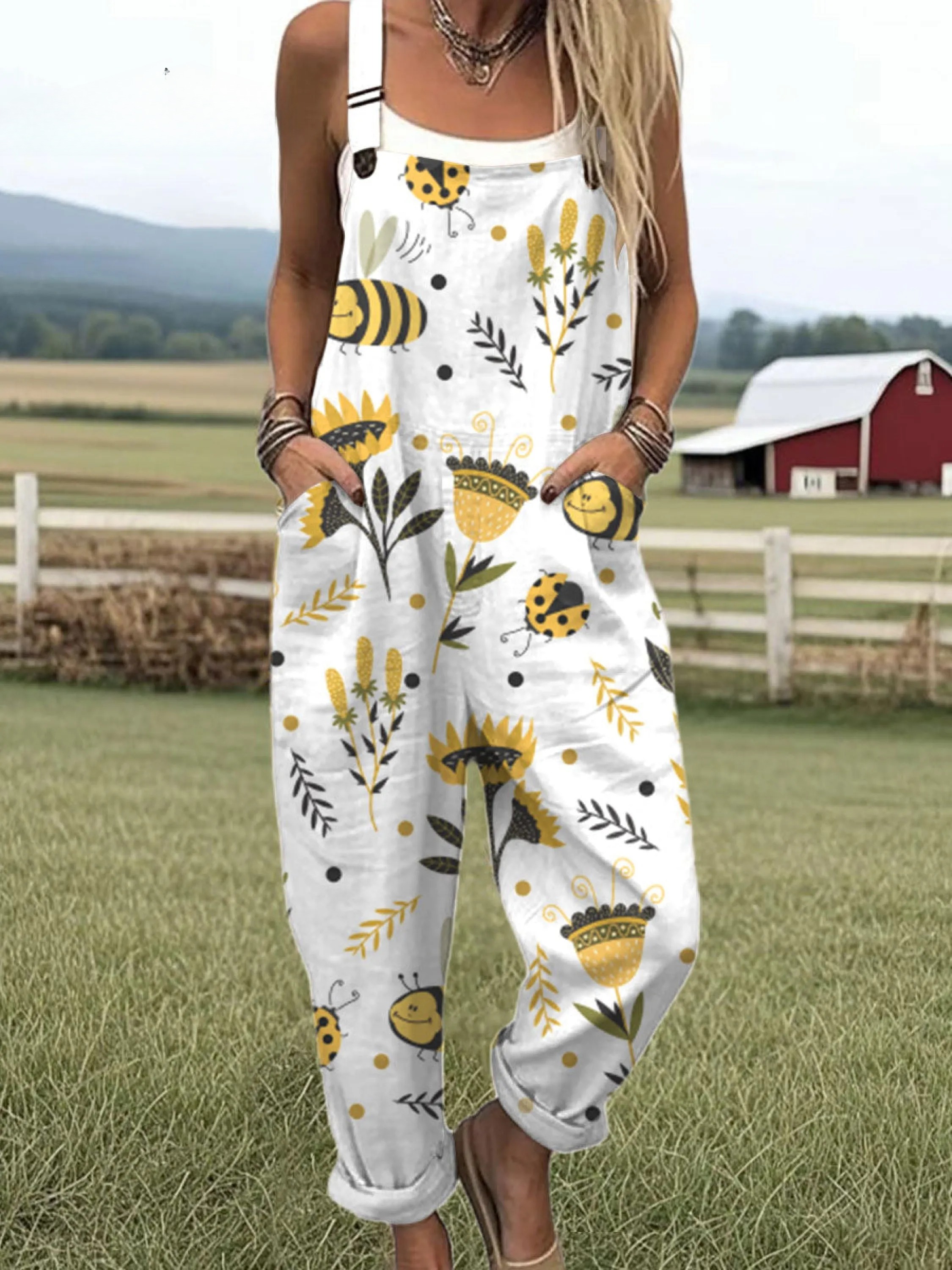 Women's Flower Bee Print Casual 100% Cotton Wide Leg Jumpsuit