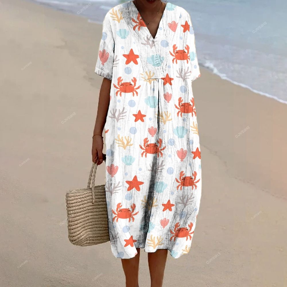 Women's Cartoon Crab Shell Printed Flowy Dress