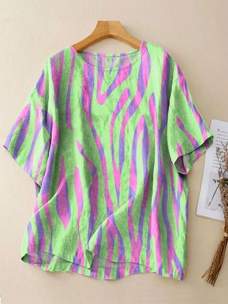 Women's Vintage Colorblock Striped Art Print Casual Crew Neck Shirt