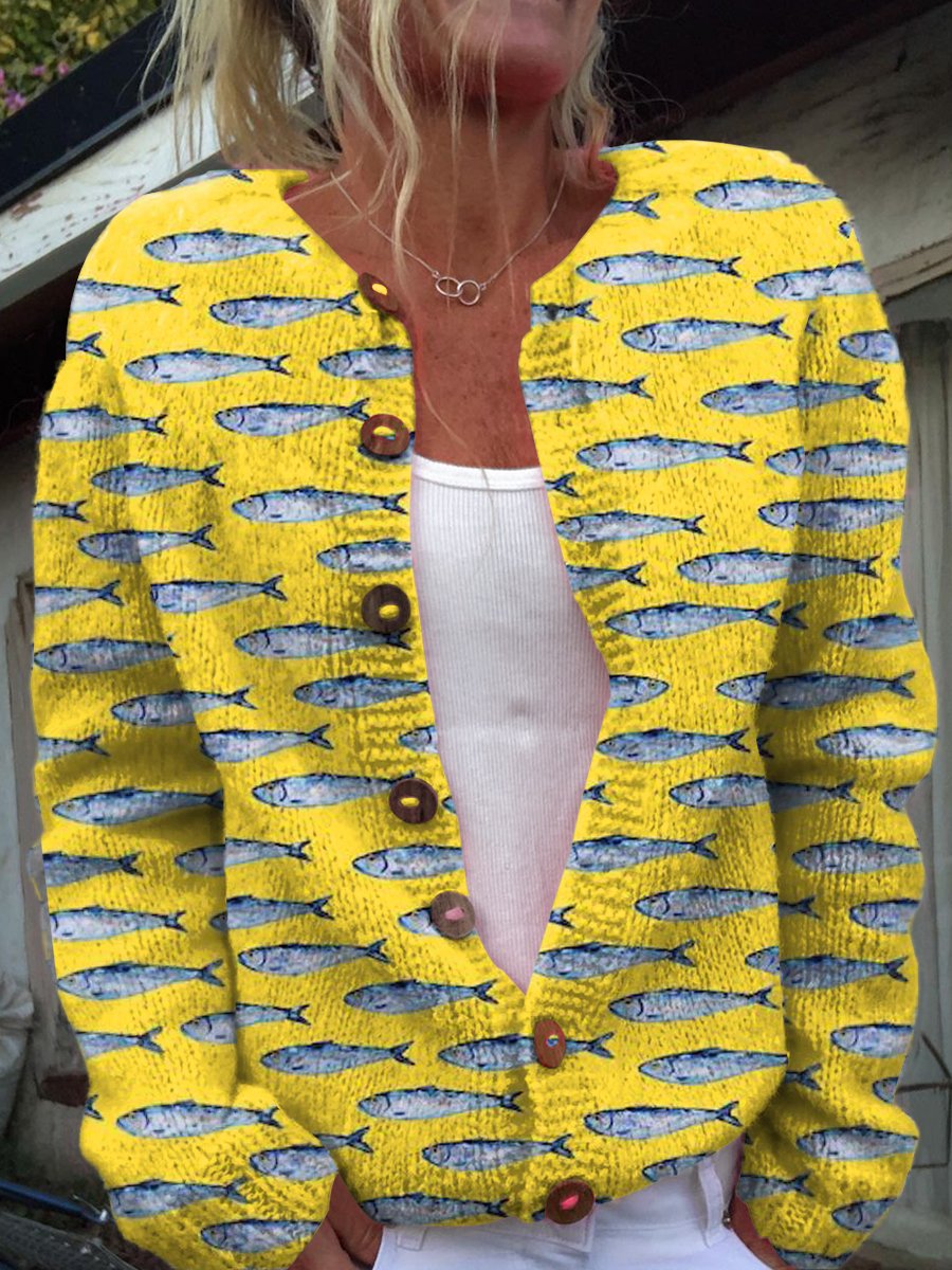 Cute Little Yellow Sardines Print Buttoned Cardigan Sweater