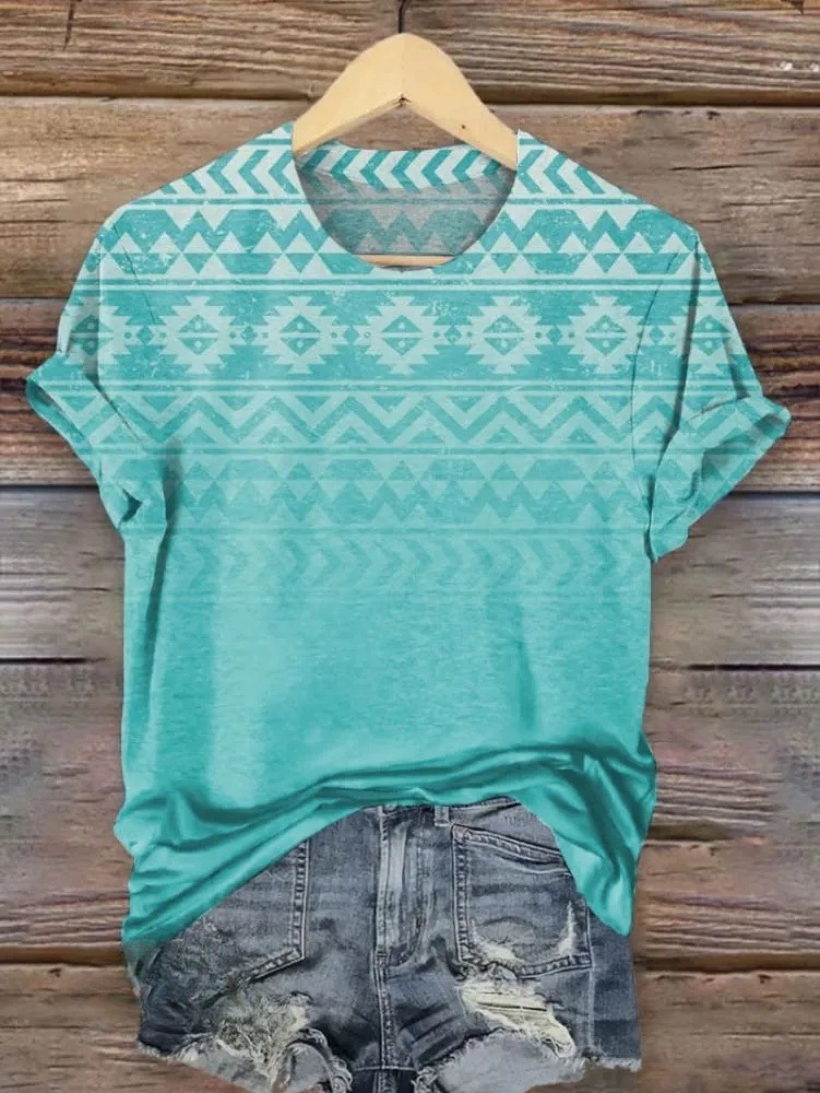 Crew Neck Colorful Geometric Printed Casual Cotton T-shirt