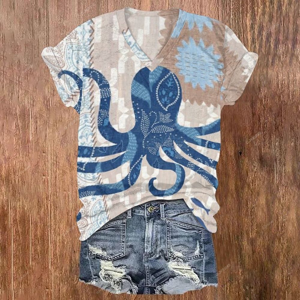 Women's V-neck Vintage Octopus Printed Short Sleeve T-shirt