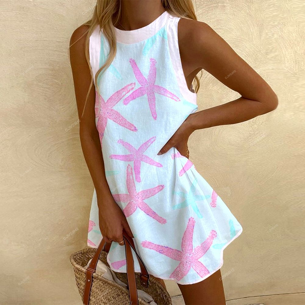 Women's Sleeveless Pink Starfish Printed Dress