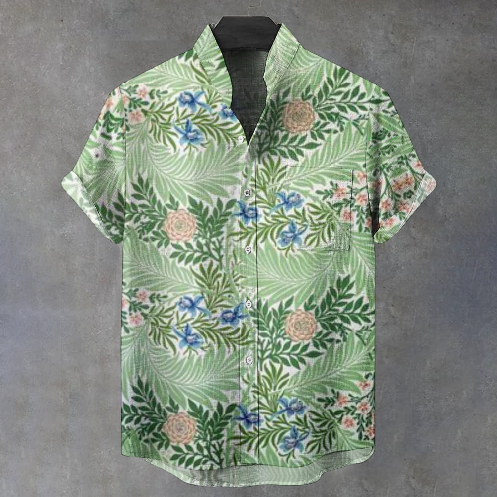 Men's Stand Collar Leaves Printed Short Sleeve Shirt