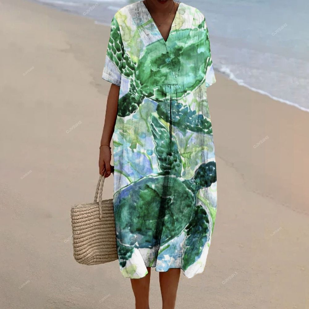 Women's Ocean Vintage Art Print Sleeveless Cotton Pocket Wrap Dress