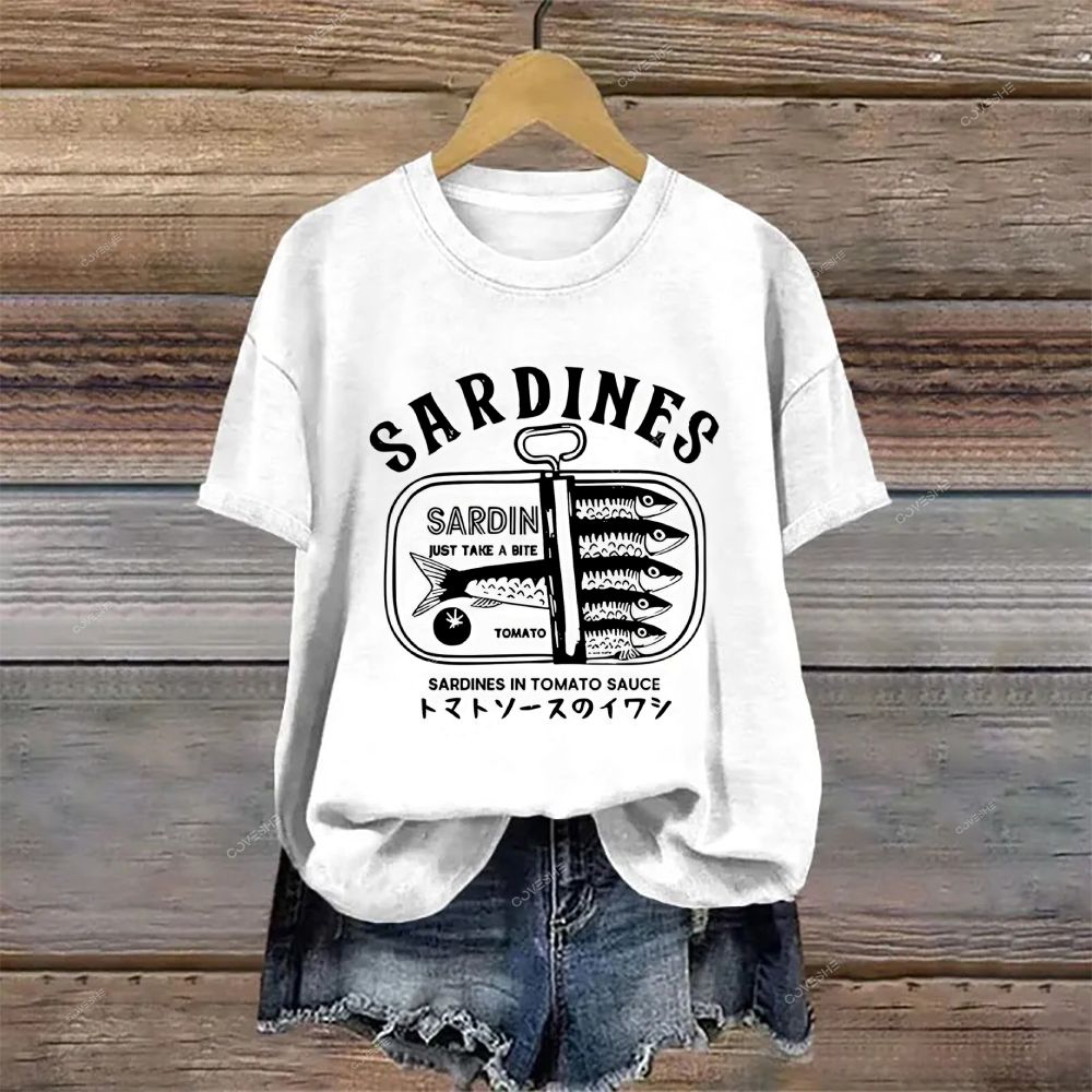Crew Neck Sardines Canned Printed Casual Cotton T-shirt