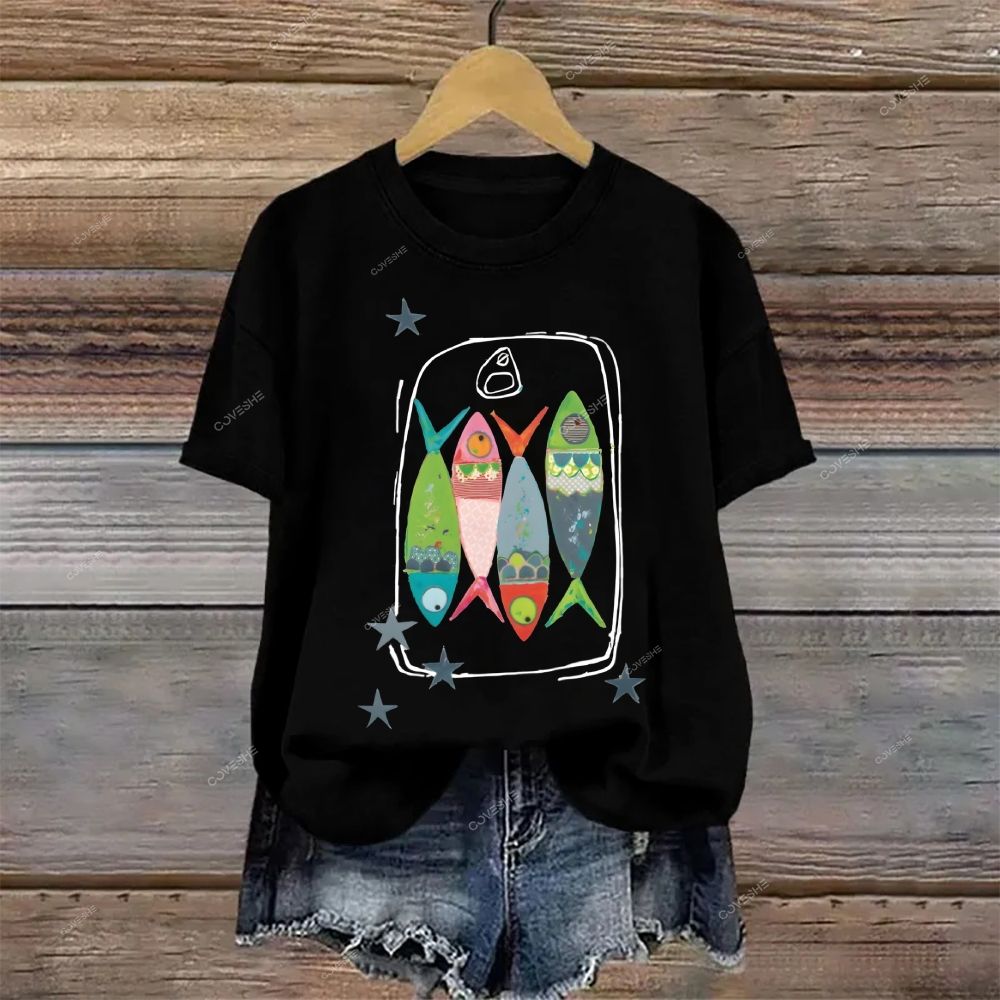 Crew Neck Canned Fish Printed Casual Cotton T-shirt