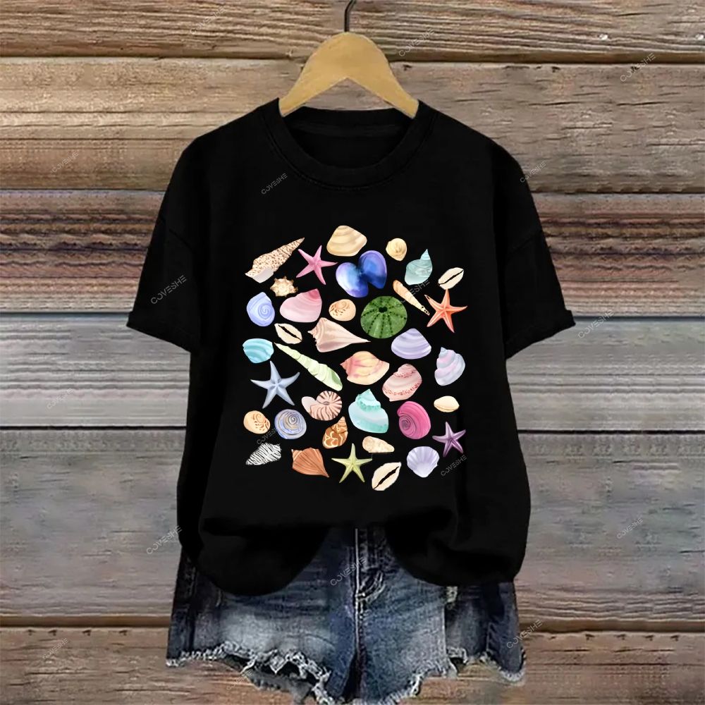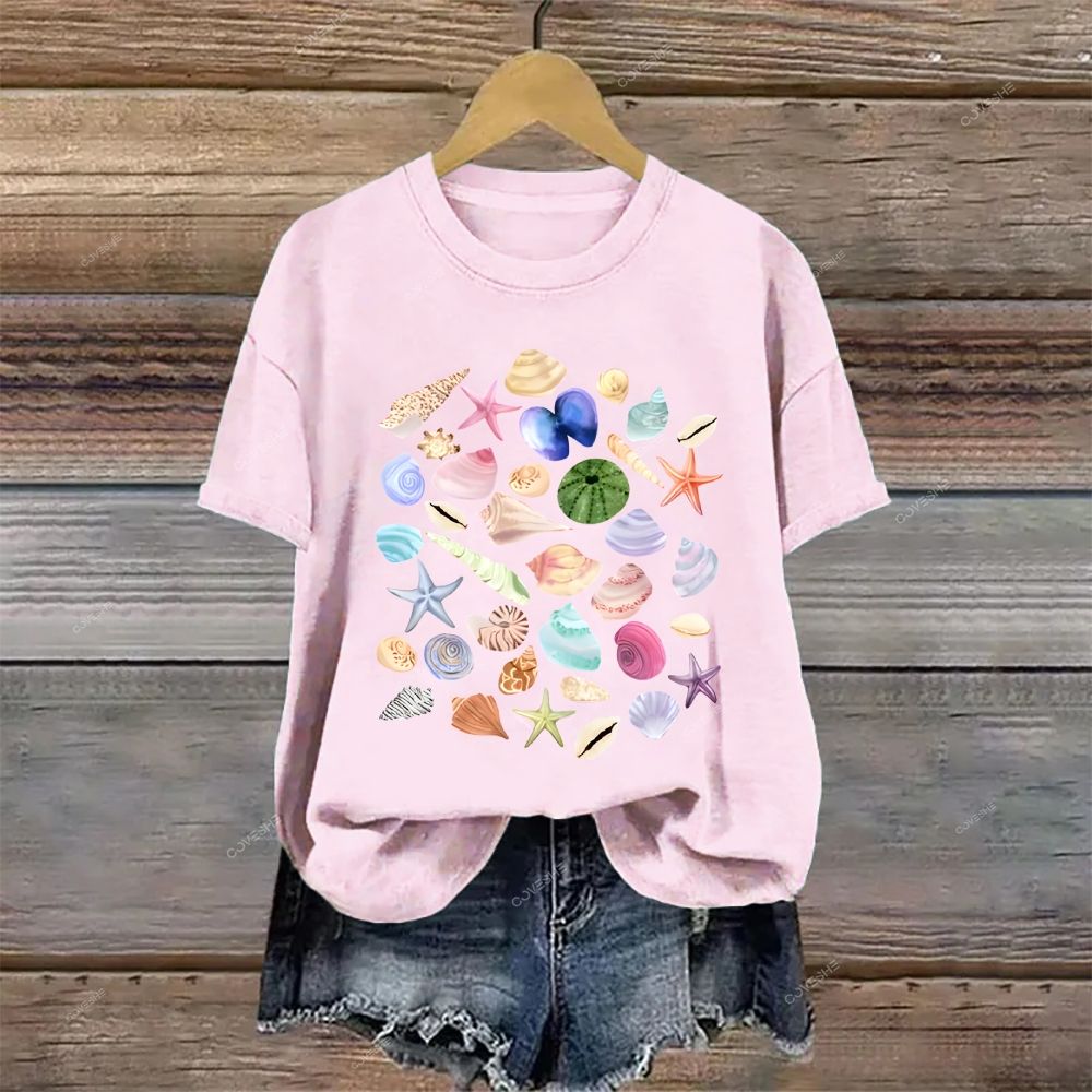 Crew Neck Ocean Shells Printed Casual Cotton T-shirt