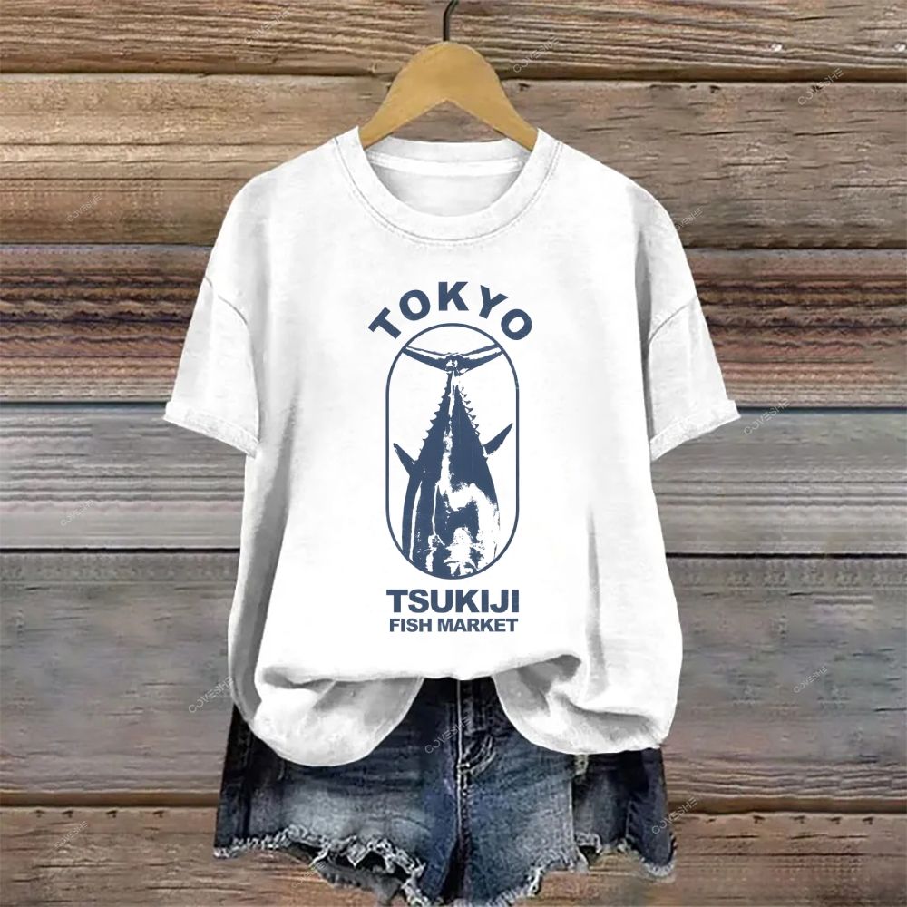 Crew Neck Tokyo Tsukiji Fish Market Printed Casual Cotton T-shirt