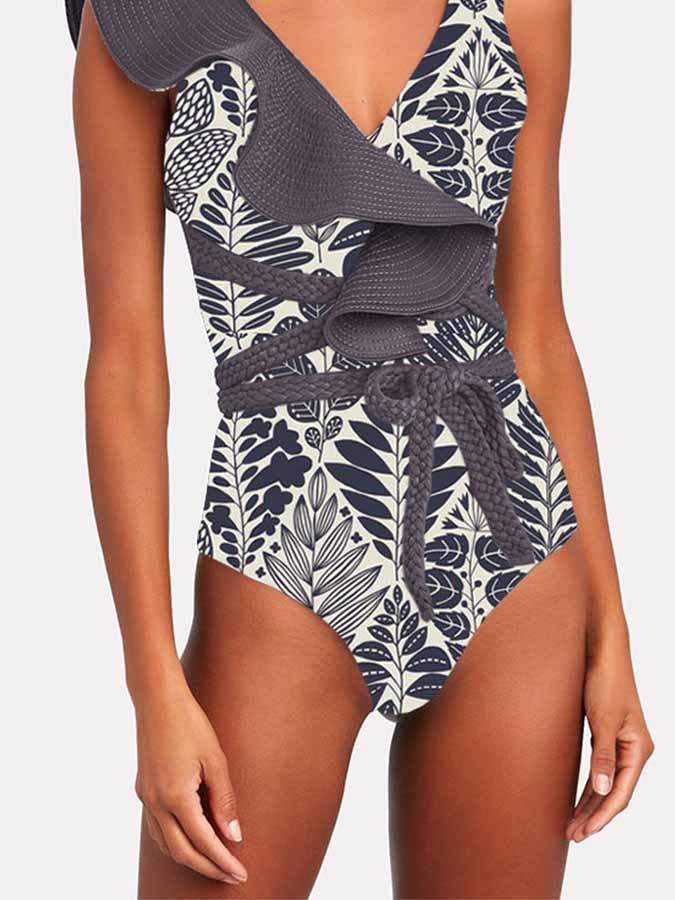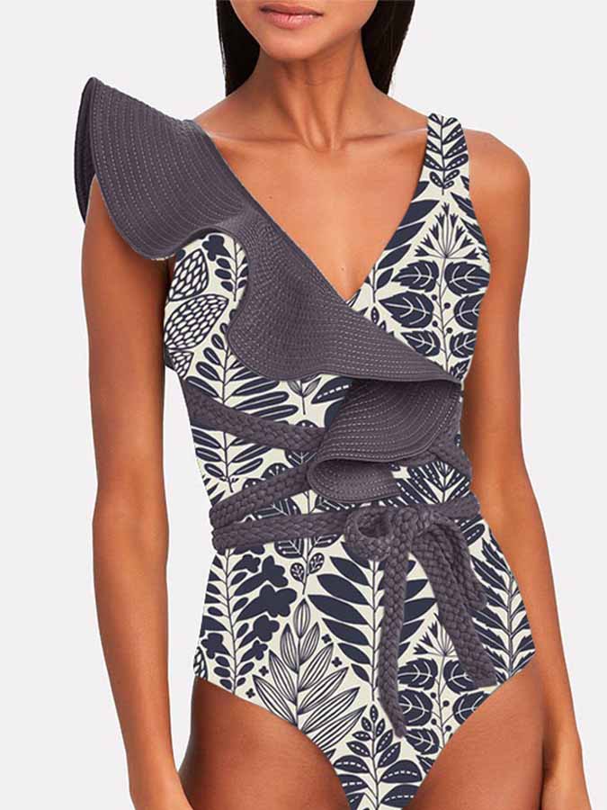 Deep V-Neck Colorblock Print Ruffle One-Piece Swimsuit