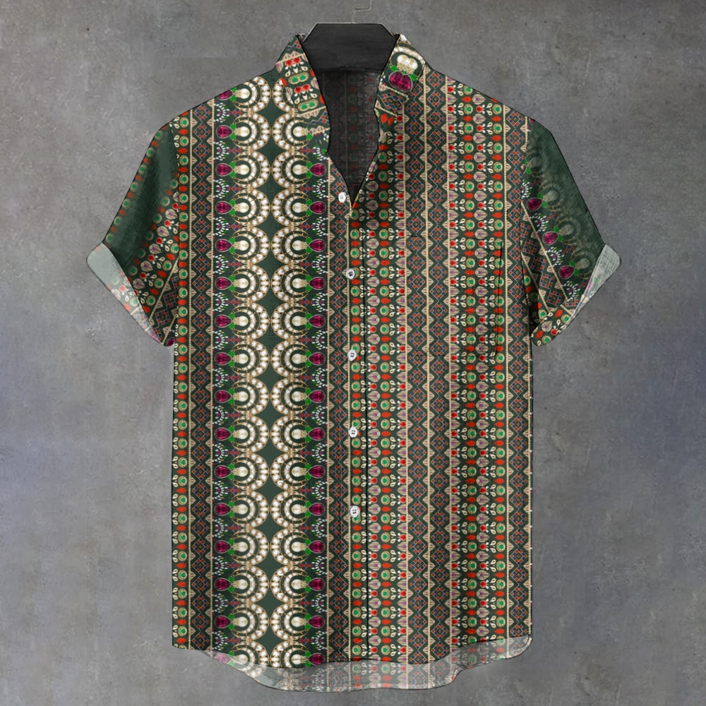 Men's Stand Collar Vintage Ethnic Stripe Pattern Printed Short Sleeve Shirt