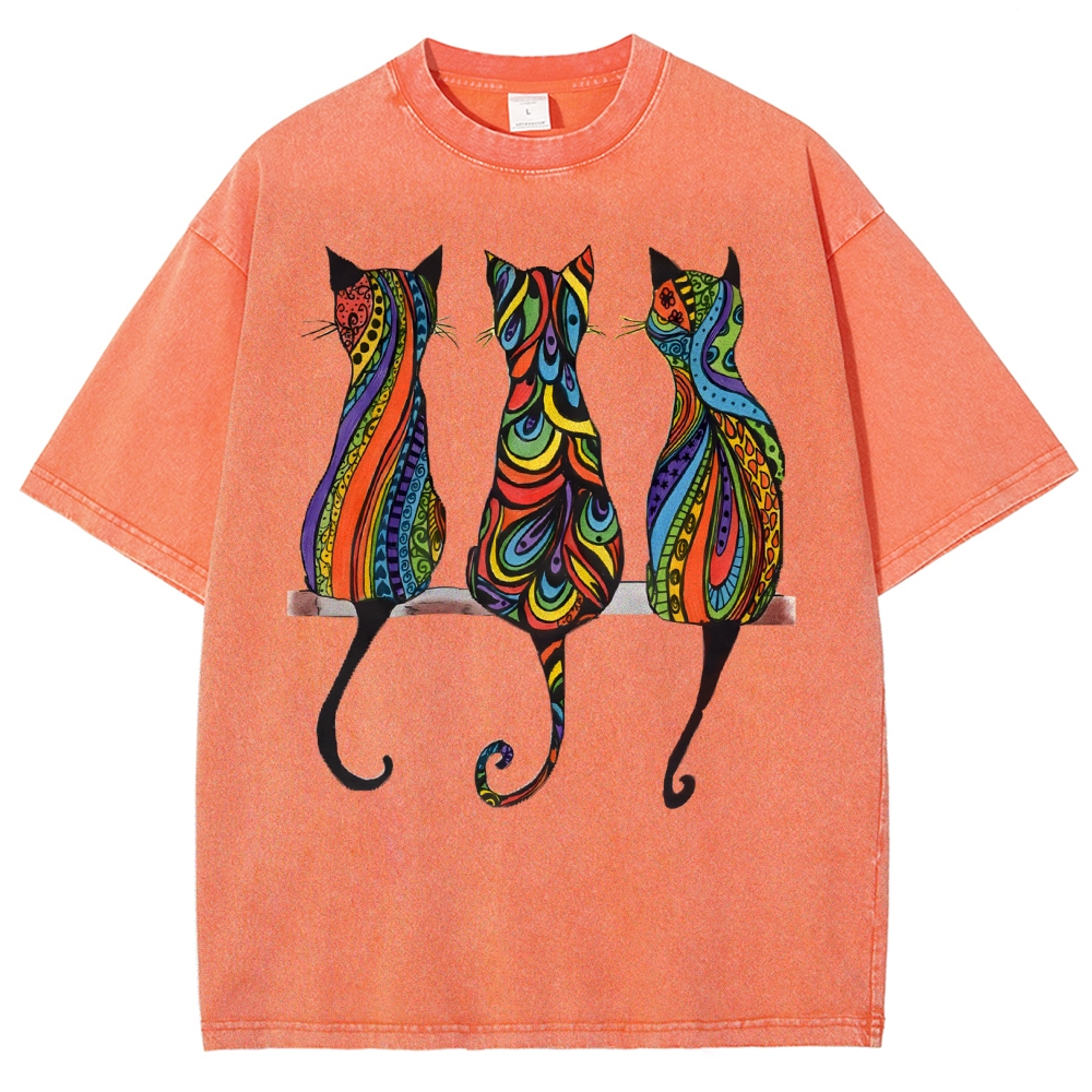 Unisex Colorful Geometric Cat Printed Washed Tee