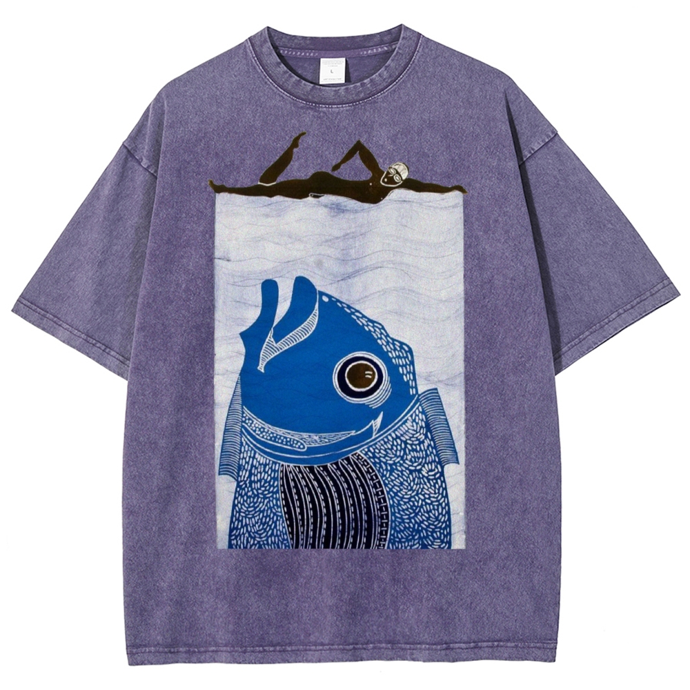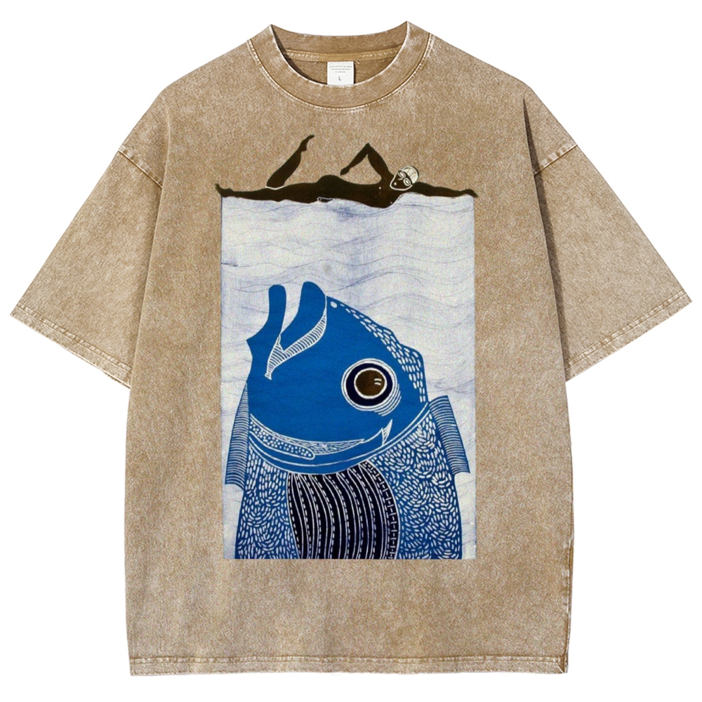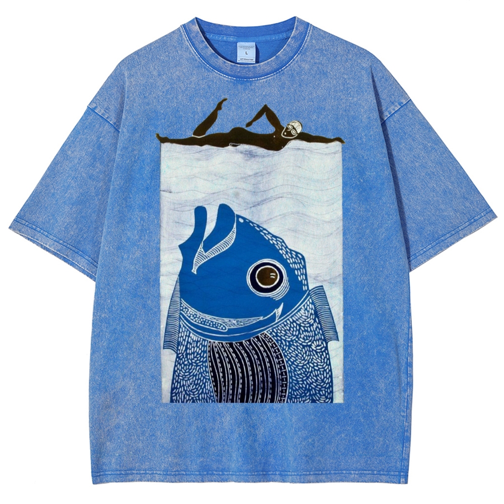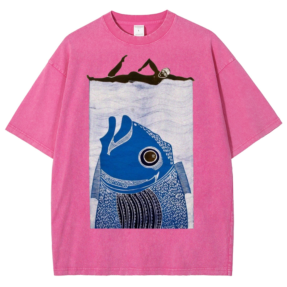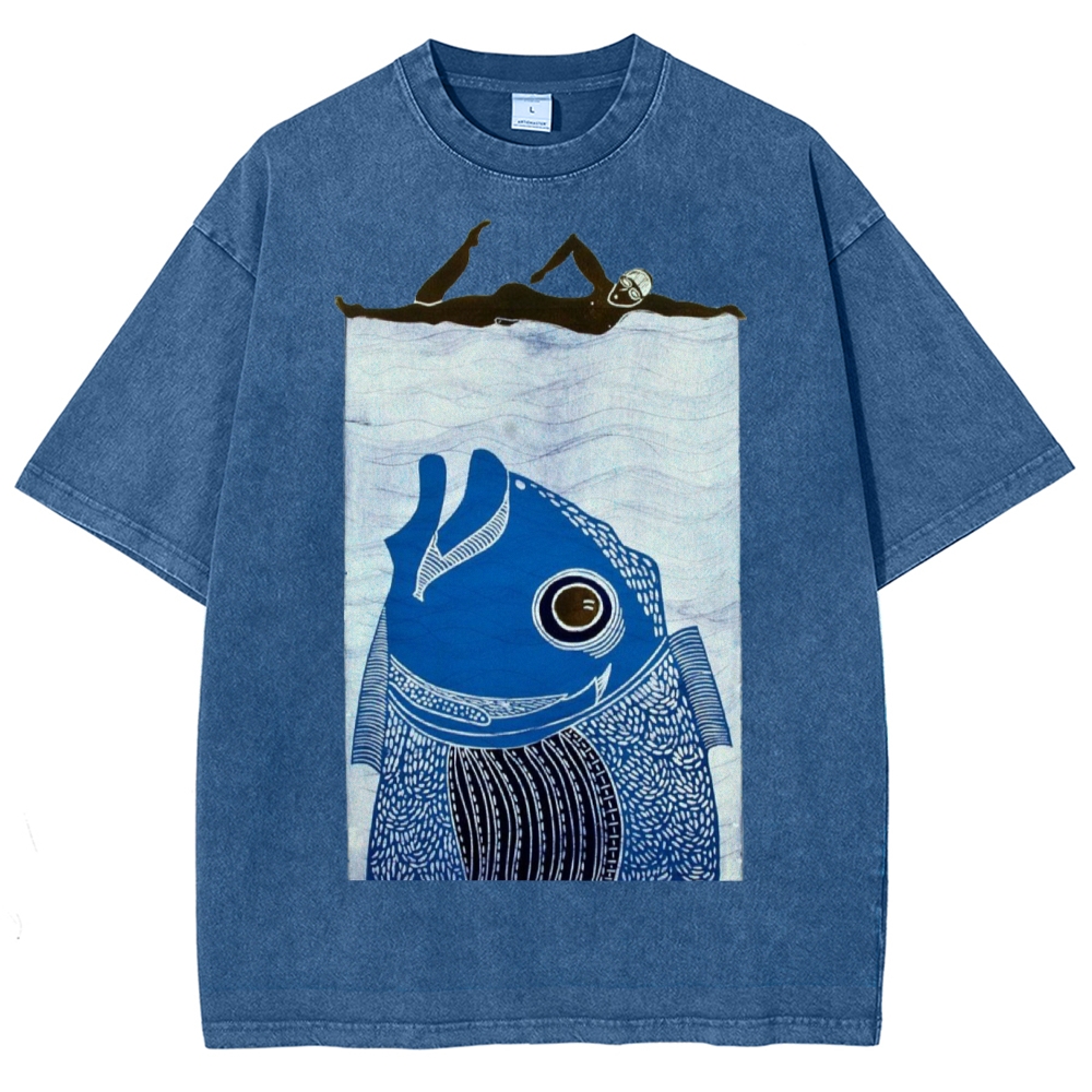 Unisex Fish Printed Washed Tee