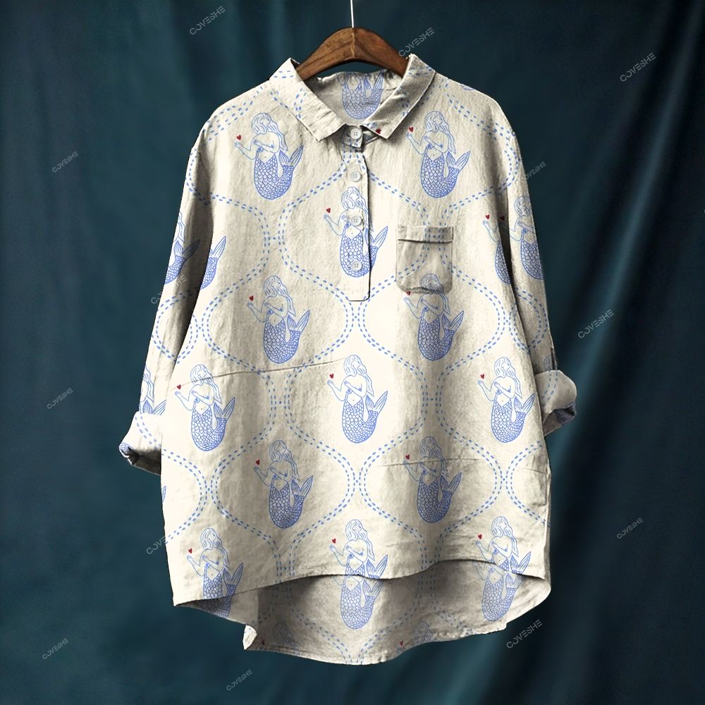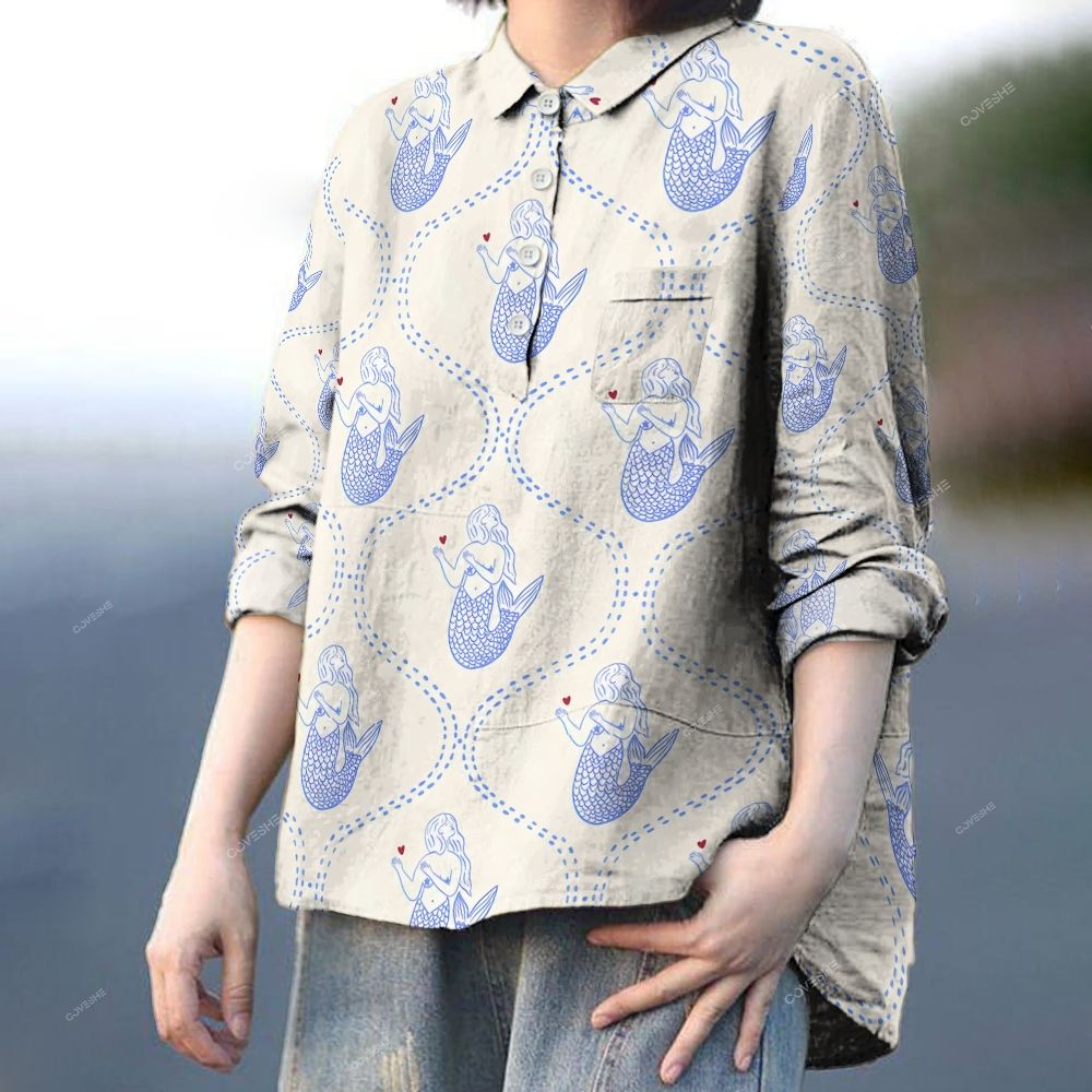 Women's Cartoon Mermaid Printed Casual Long Sleeve Shirt