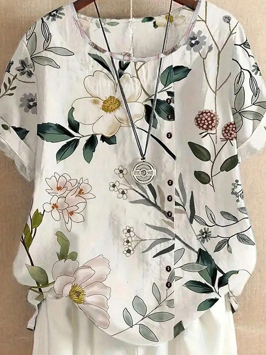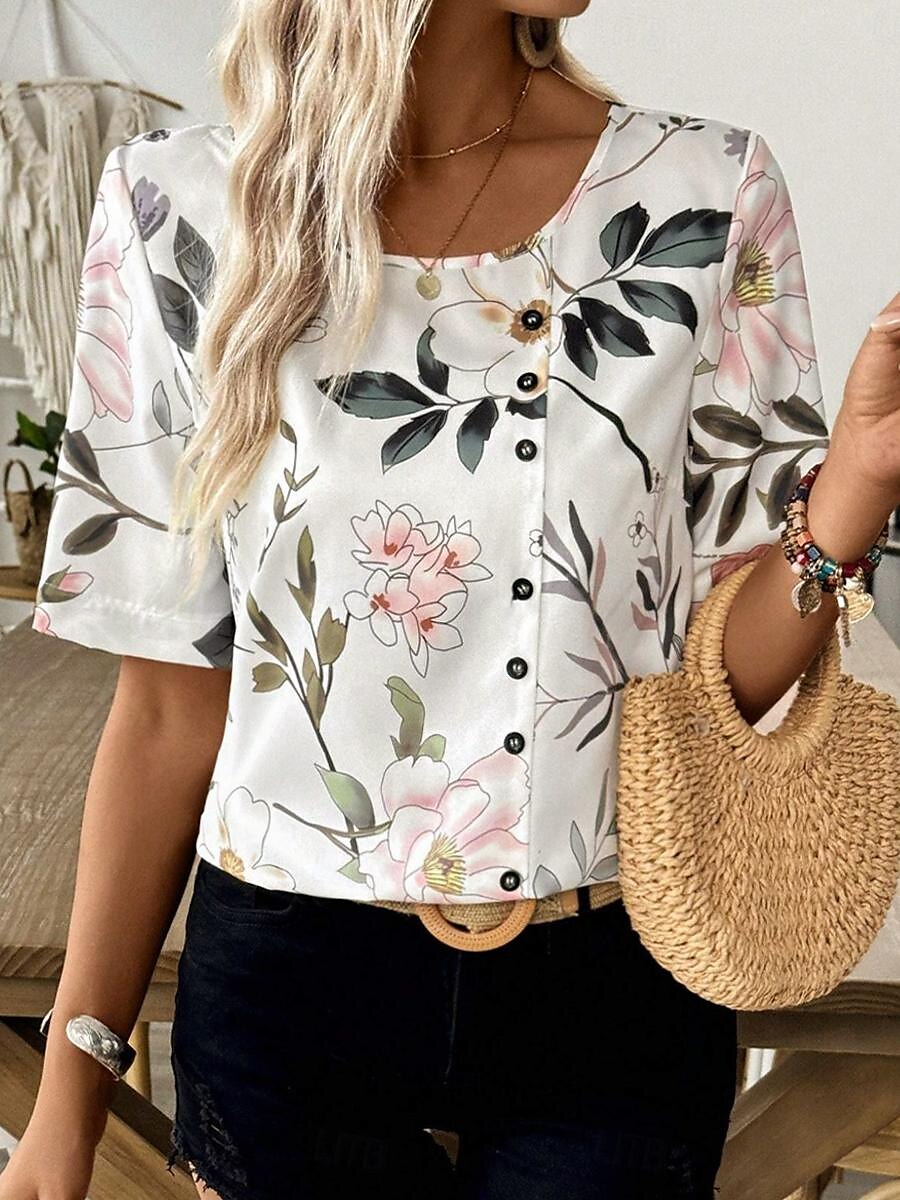 Women's Elegant Short-Sleeved Blouse with Floral Print