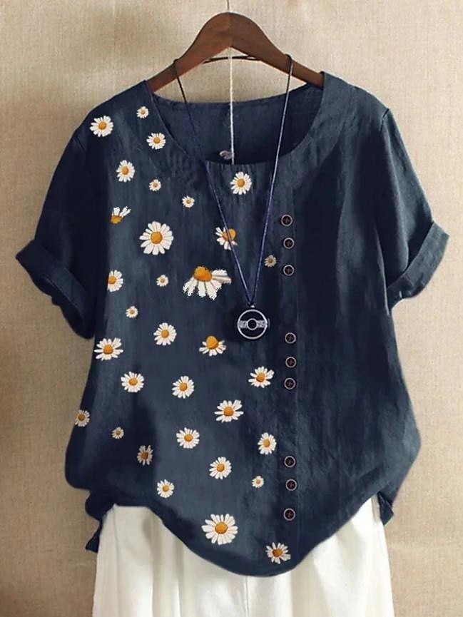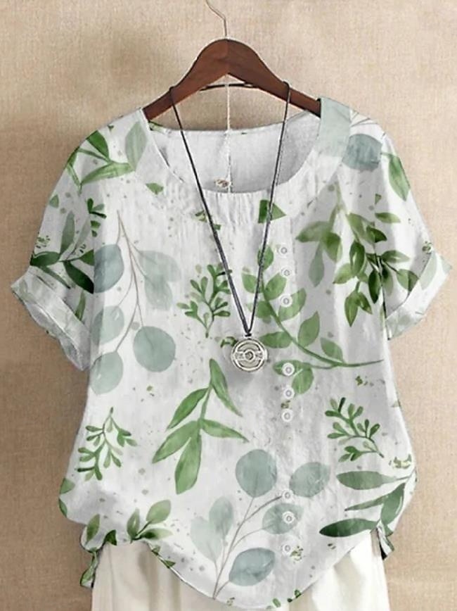 Women's Short - Sleeved Blouse. Elegant Graphic Floral & Leaf Print