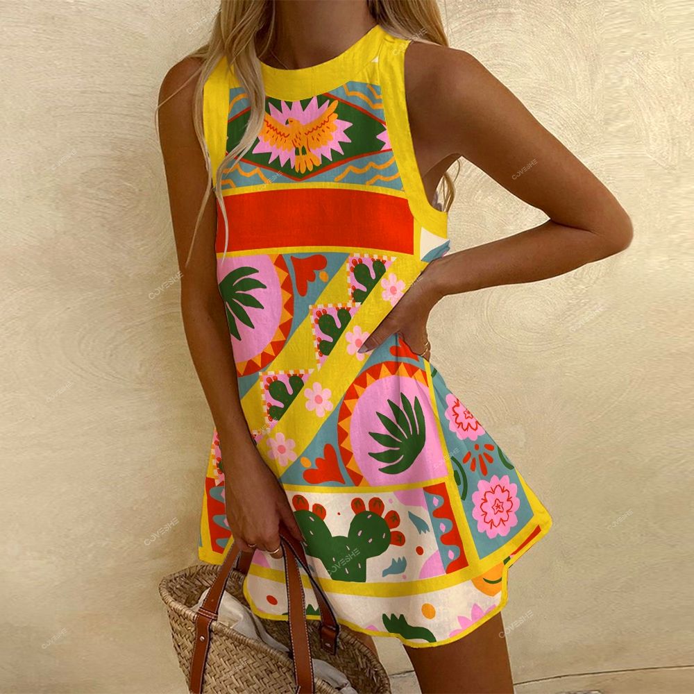 Women's Sleeveless Artistic Flowers And Plants Printed Dress