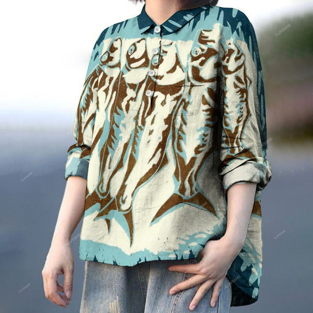Women's Vintage Fish Printed Casual Long Sleeve Shirt