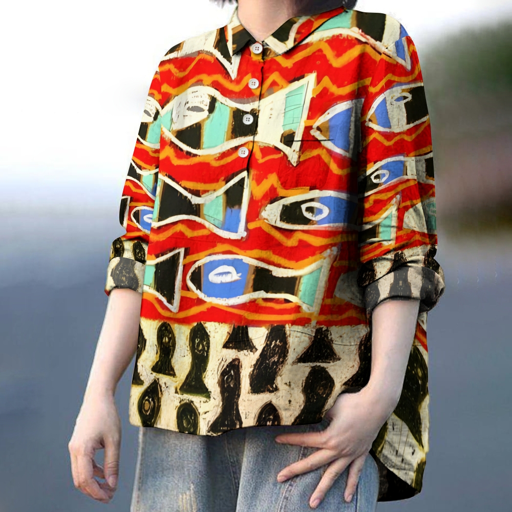 Women's Vintage Geometric Fish Printed Casual Long Sleeve Shirt