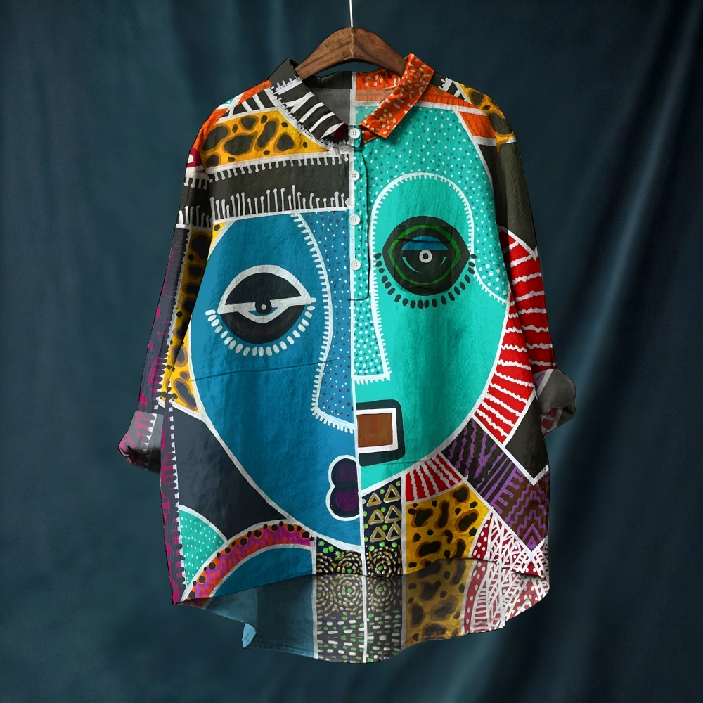 Women's Abstract Art Face Printed Casual Long Sleeve Shirt
