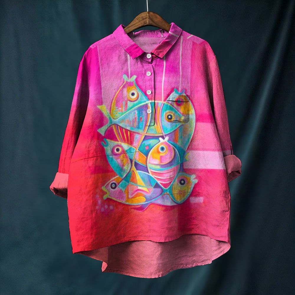 Women's Colorful Cartoon Fish Printed Casual Long Sleeve Shirt