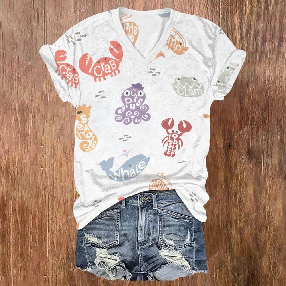 Women's V-neck Octopus Crab Fish Printed Short Sleeve T-shirt
