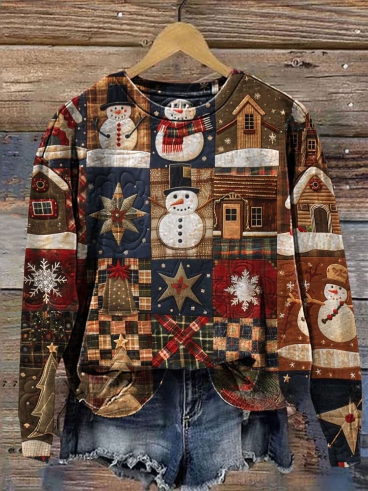Retro Christmas Patchwork Art Prrint Casual Sweatshirt