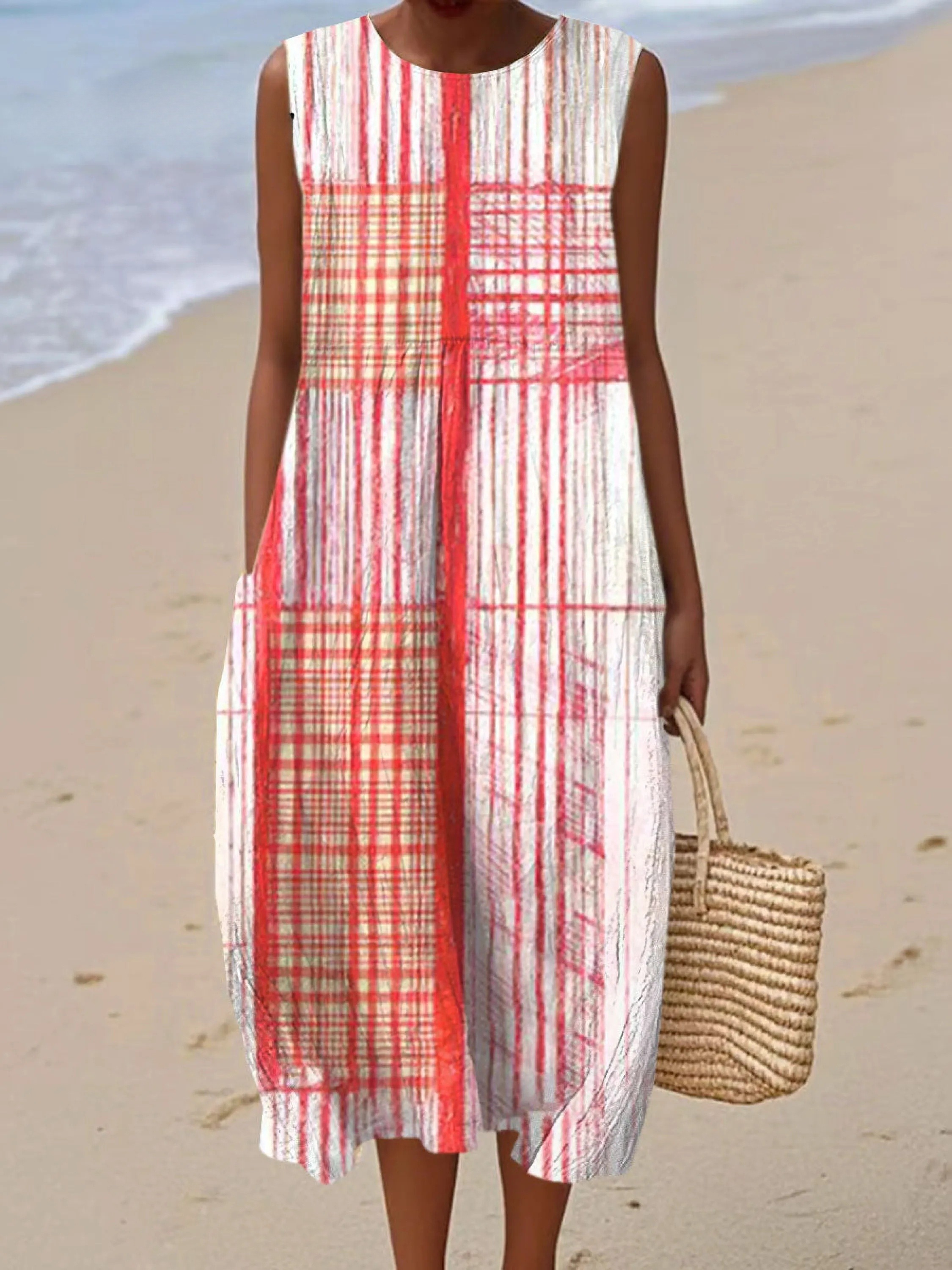 Women's Vintage Abstract Geometric Art Print Sleeveless Cotton Pocket Wrap Dress