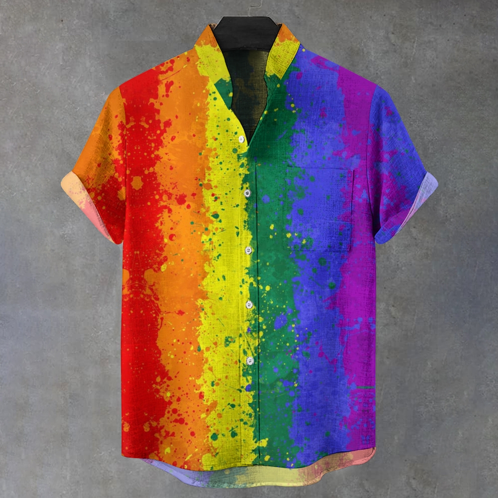Men's Stand Collar Rainbow Heart Printed Short Sleeve Shirt