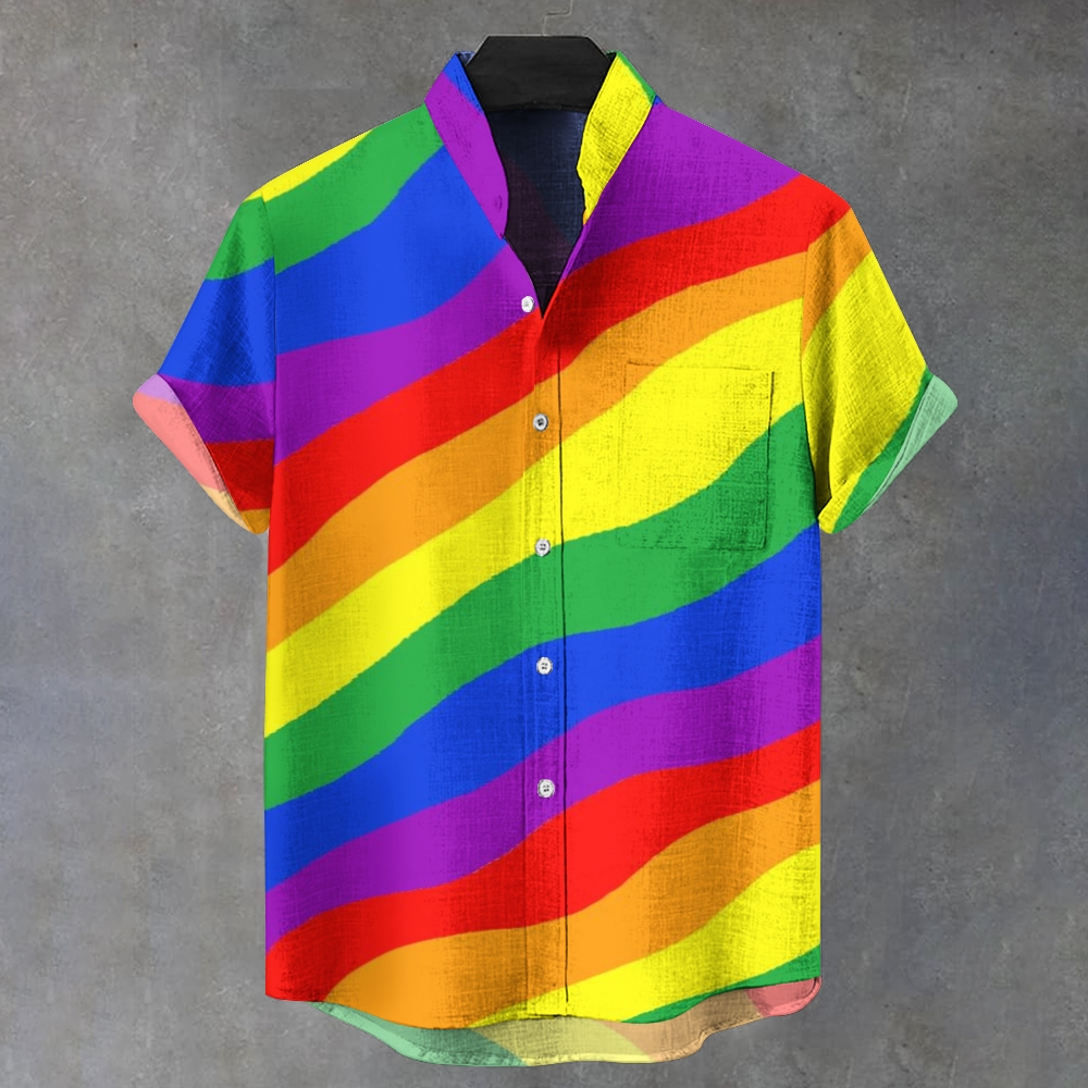 Men's Stand Collar Rainbow Stripe Printed Short Sleeve Shirt