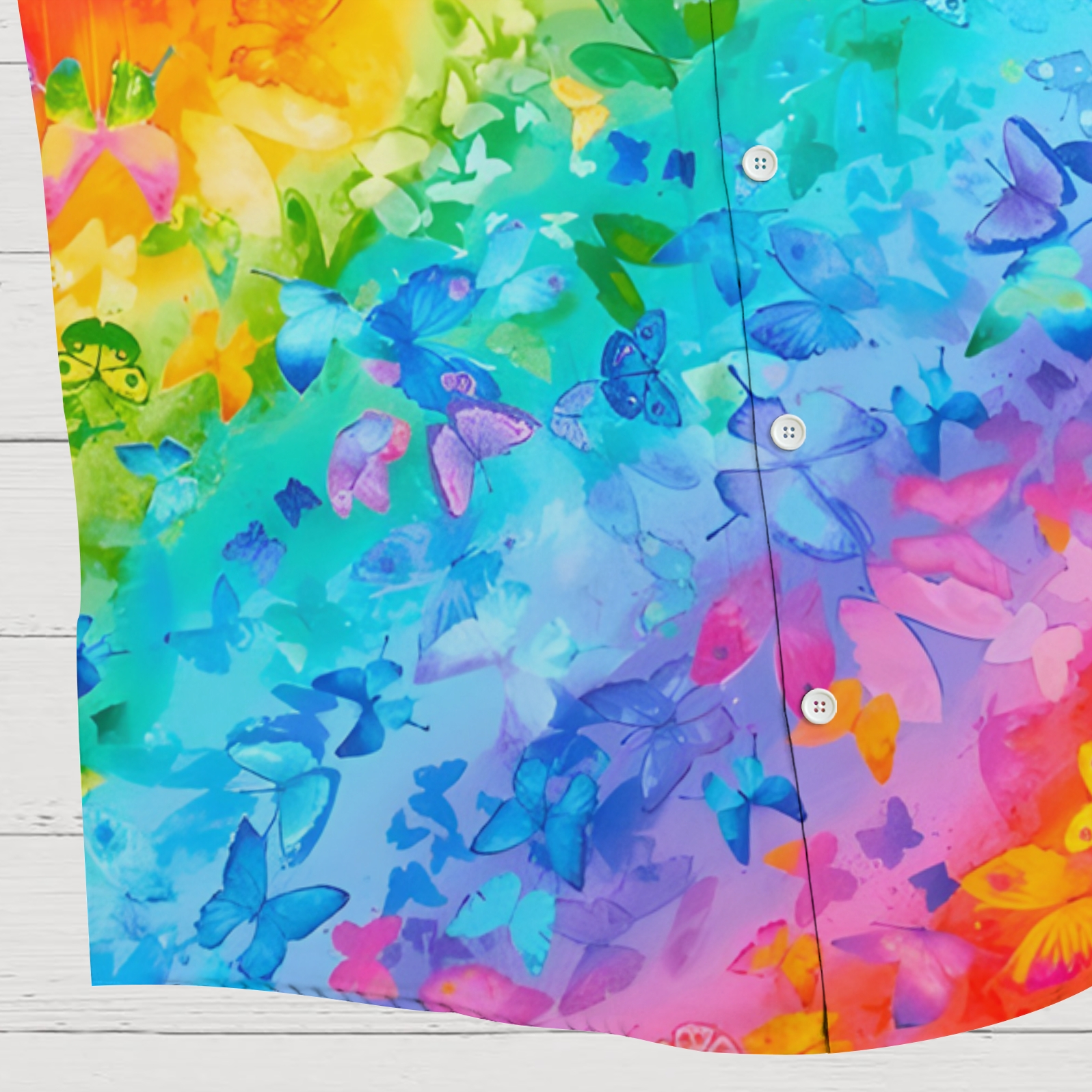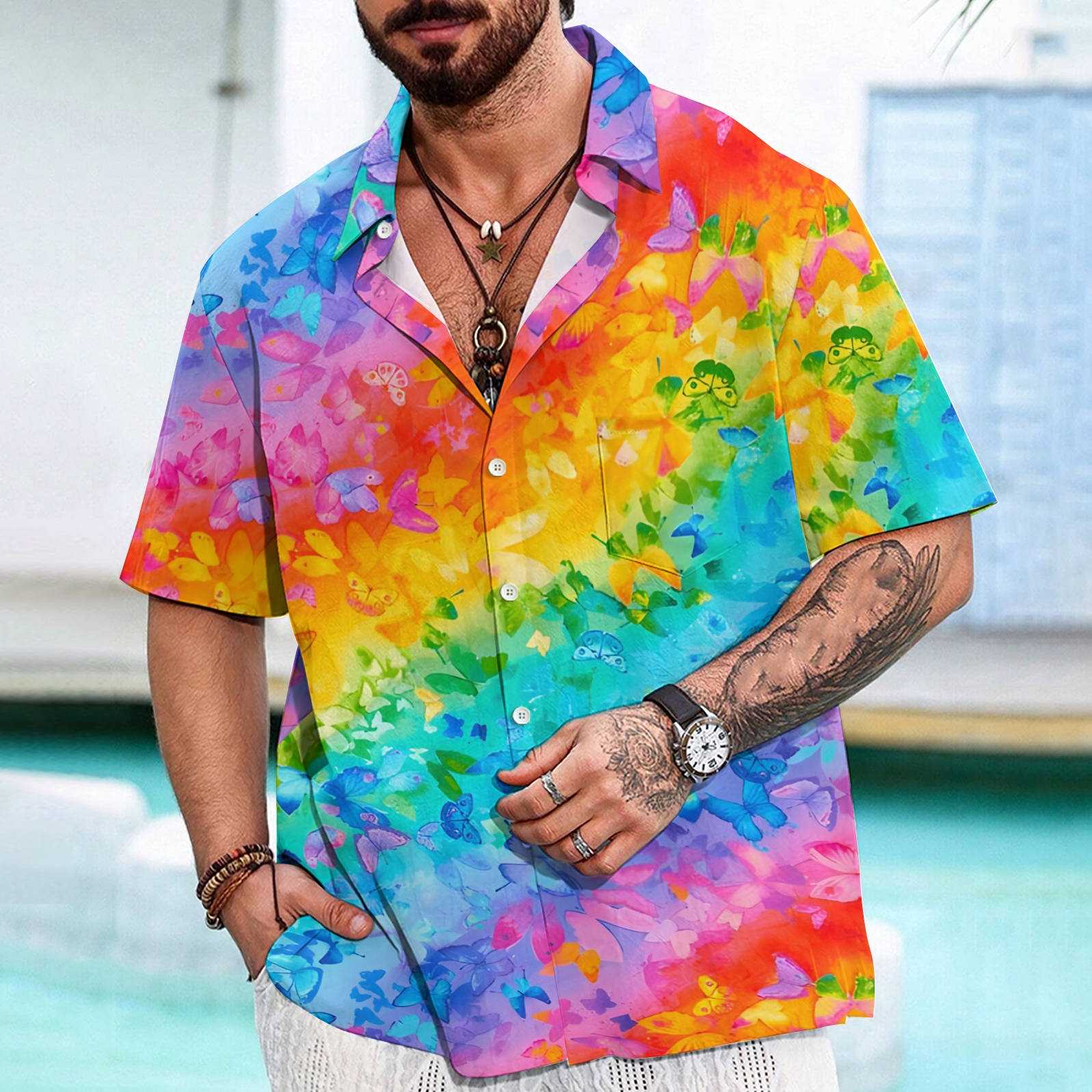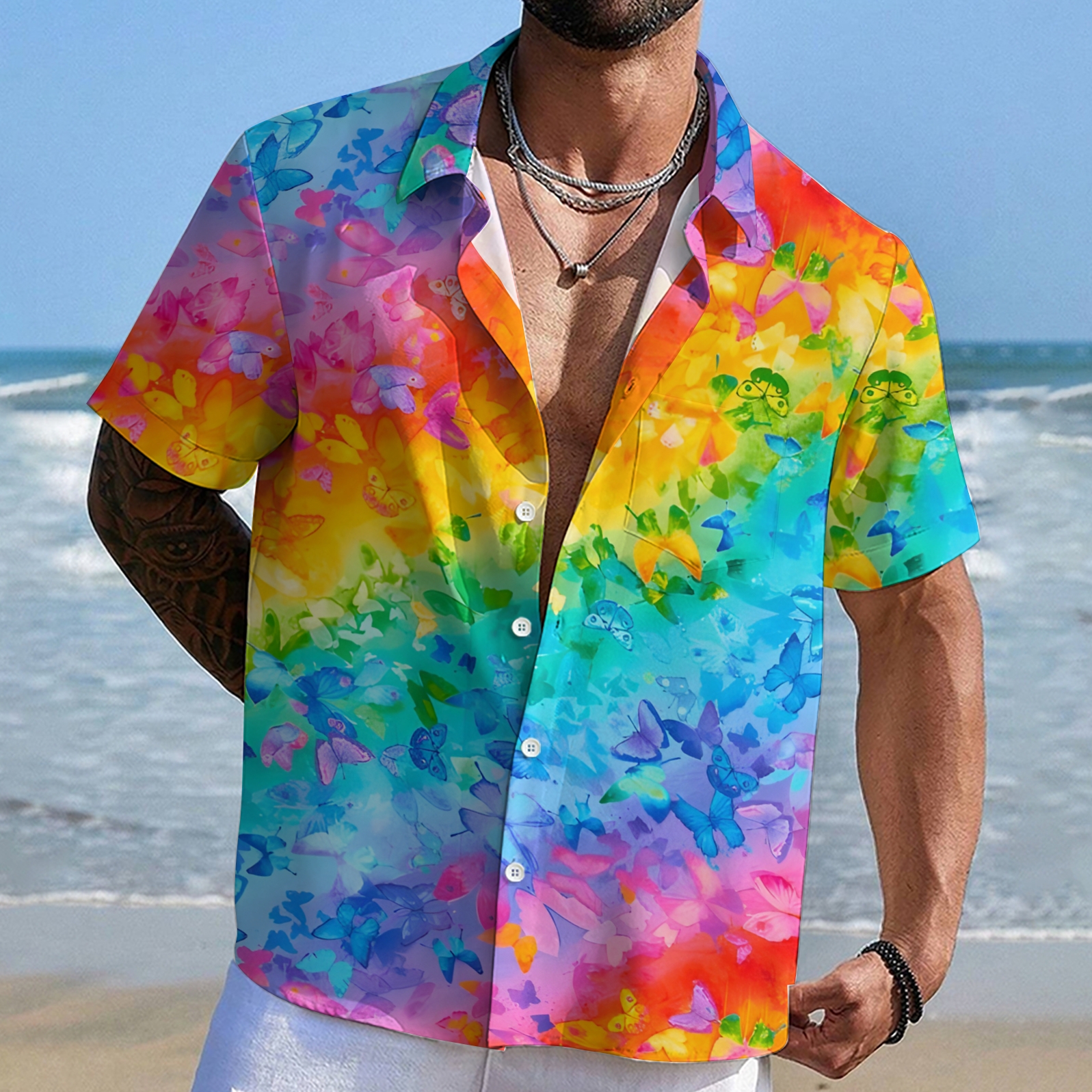 Men's Shirt Collar Resort Rainbow Butterfly Printed Short Sleeve Shirt