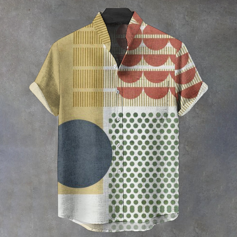 Men's Stand Collar Vintage Abstract Line Printed Short Sleeve Shirt