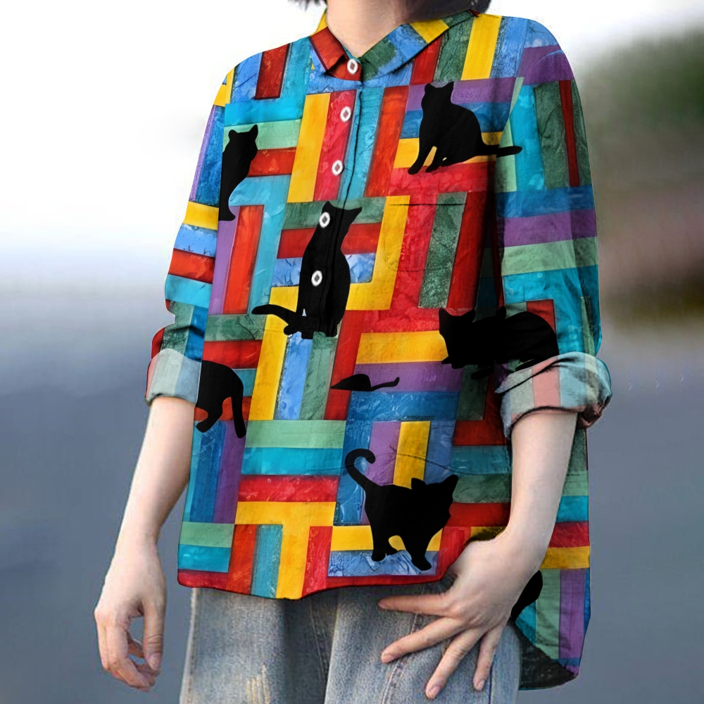 Women's Colorful Geometric Cat Printed Casual Shirt