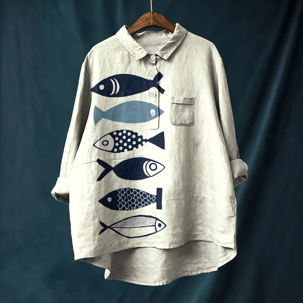 Women's Simple Cartoon Fish Printed Casual Long Sleeve Shirt